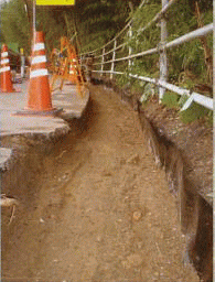 ※左の写真は道の脇を掘り起こし、防根・防竹シート(右側面の黒色シート)を垂直に敷設した様子です。